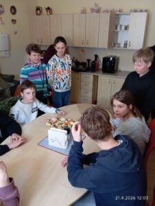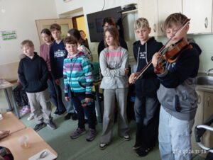 Potom jsme šli na prohlídku celé budovy, kde jsme se podívali, jak klienti žijí. Pro všechny to bylo velmi zajímavé a poučné. Žák 6. B Vojtěch Braný zahrál zúčastněným skladbu od Antonína Dvořáka. Žáci třídy 5. B vyrobili nádherná přáníčka. Houslová hudba, přáníčka a naše návštěva udělaly veliký dojem na klienty zařízení.